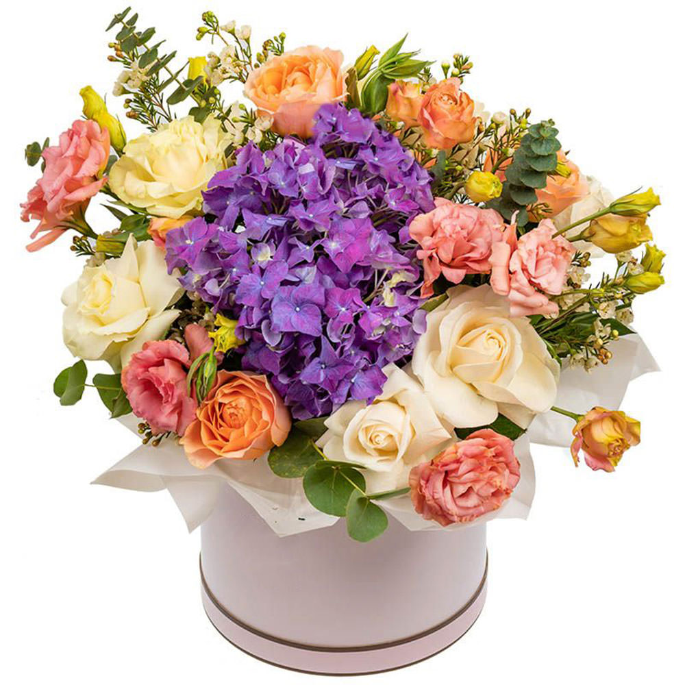 Гортензия, роза пионовидная кустовая, эустома, зелень.